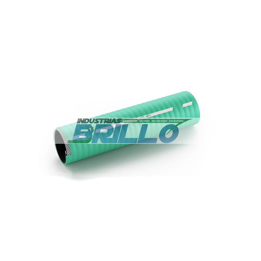 Manguera para aspiración de e impulsión de productos químicos. Temperatura de -25ºC a +80ºC. Tubo interior de caucho termoplástico negro. Refuerzos textiles de alta tenacidad y alambre de acero galvanizado. Cubierta exterior de caucho termoplástico verde. Marcada con el nombre.